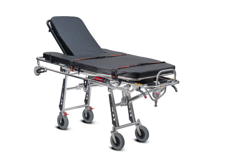 Self loading stretcher for bariatric transport Self loading stretcher for bariatric transport made of a special high resistance stainless steal alloy. The frame is renforced to ensure a 350 kg maximum payload compared to others MeBer self loading stretchers. It is supplied with 2 frontal Ø125x25 and 2 back Ø125x25 wheels for maximum safety during loading operations. The increased 4 Ø200 mm wheels, 2 fixed with brake and 2 rotating with self-centring system, allow easy manoeuvrability even with heavy loads. The rigid platform, composed by aluminium, is easy to clean and disinfect. It also has an adjustable backrest with lockable gas spring for inclinations from 0° to 80° and fully folding sides. Vertical legs are protected by plastic buffers. This stretcher is supplied complete with mattress (art. 7013) and belts (N. 2 art. 608-A/MEB or 608-N/MEB and n. 1 art. 612/AN-2/MEB or art. 612/N-2/MEB).Thanks to the increased load capacity it can be used in coupling with the MBP bariatric platform (Article code 12080) and bariatric wings set (art. 12084).