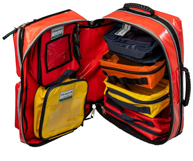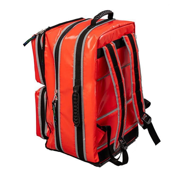 Sac à dos de sauvetage Romeo Sac à dos de sauvetage, compact et simple, adapté aux volontaires et professionnels des secours. Complètement en PVC, à cellules fermées, couleur rouge. Indéchirable, lavable et résistant, avec poche frontale transparente pour la personnalisation et sangles de rangement internes, doubles coutures, fermetures éclair solides de 10 mm, bandes réfléchissantes à haute visibilité sur tous les côtés extérieurs, fond en PVC et supports en plastique. À l’intérieur, il est doté d’une structure de protection rigide en matériau thermoplastique et d’un grand compartiment central avec une ouverture frontale à double fermeture éclair et avec 2 poches frontales externes. Le compartiment central est équipé de fermetures Velcro® permettant de fixer 4 étuis de couleur standard (Art. 1362-002), et 2 sacs professionnels (Art. 1362-001), également standard. Le sac est doté de trois poignées antidérapantes revêtues de caoutchouc pour le transport à la main et de deux bretelles renforcées avec bandes réfléchissantes.Dimensions: 33 x 54 x 36 cm (H x L x P). Poids: 3,8 kg